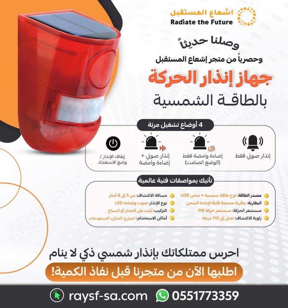 - المميزات:تشغيل بالطاقة الشمسية: يعمل بشكل كامل بالطاقة الشمسية دون الحاجة إلى أسلاك أو بطاريات إضافية.