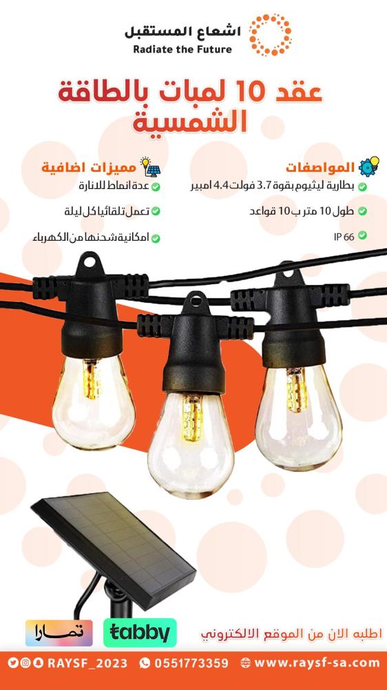 سواء كنت ترغب في إضفاء لمسة جمالية ساحرة على حفلاتك الخارجية، أو تزيين حديقتك، أو خلق أجواء رومانسية في المساء، فإن هذا العقد يعد الحل المثالي لإضاءة مستدامة وعملية.